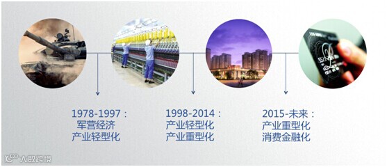 2015年很可能成为两种产业经济模型的衔接点。改革开放之后,从产业经济层面,中国已经经历了两次转型,从军营经济到产业轻型化,再至产业重型化。而2015之后,产业重型化将向“消费金融化”转型。这是一段峥嵘岁月的终点,也是另一段恢弘历史的起点。而这个转折为何出现?