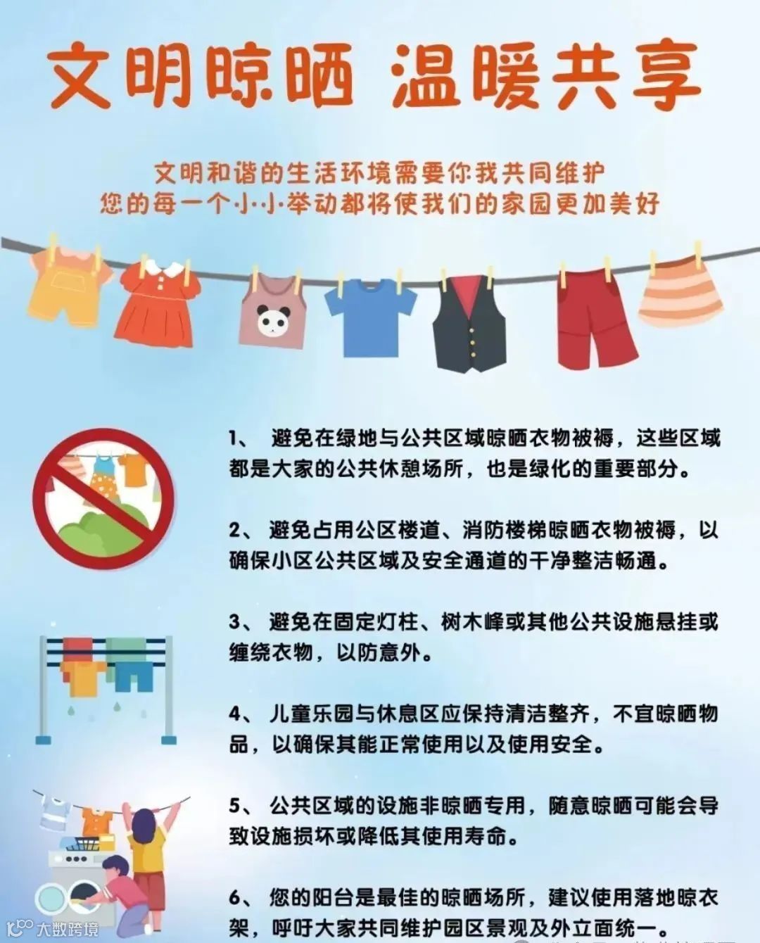 为维护小区整体环境的美观、保护园区内的绿化,维护全体业主的利益,营造美观、舒适的居住环境,同时也为了有晾晒需求的业主所晒物品的干净整洁,保护园区绿化健康生长,请大家遵循以下原则: