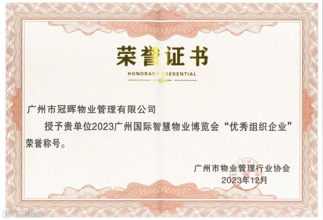 冠晖物业秉承"诚信经营 全方位优质服务"的服务宗旨,用实际行动提升物业服务质量,积极践行物业服务社区基层治理的初心和使命。荣获广州市物业管理行业协会颁发“2023年优秀学习型企业”、“2023年年度贡献会员单位”,同时积极参与广州国际智慧物业博览会,荣获“2023年广州国际智慧物业博览会优秀组织企业”3项企业荣誉。