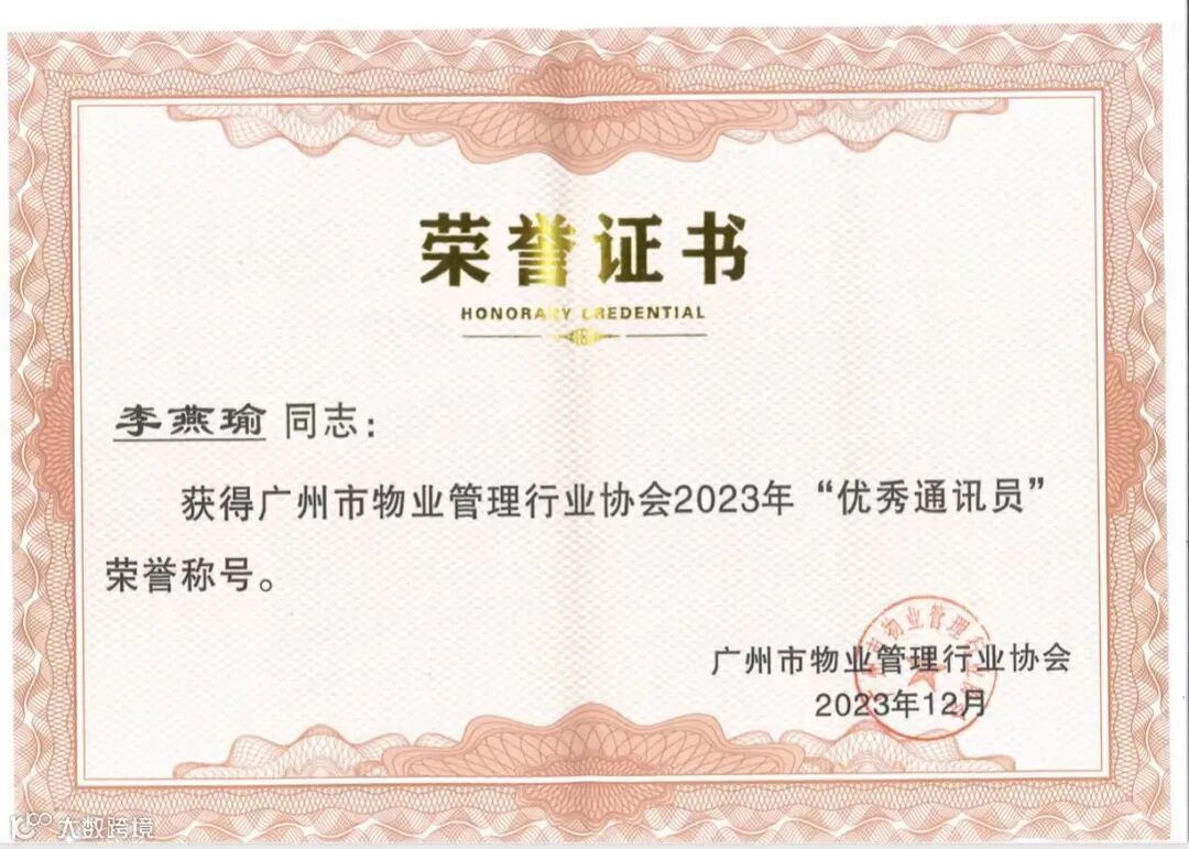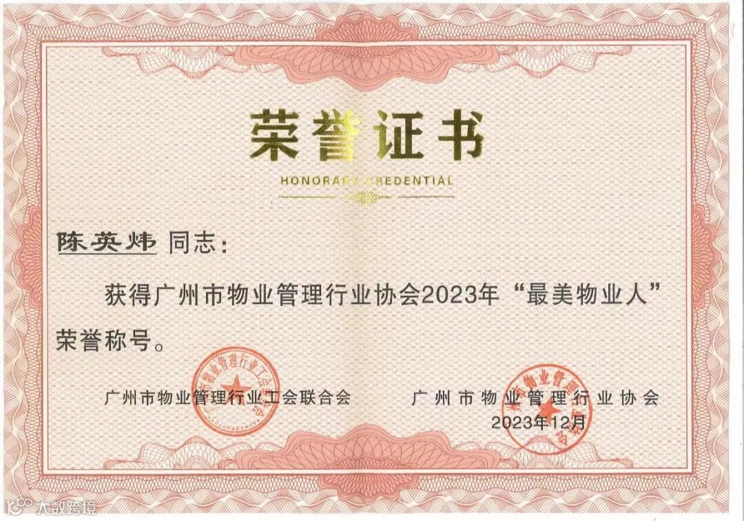 微光成炬,星火燎原,每一位优秀的物业人都是行业的荣耀和财富。此次冠晖物业多位优秀员工从众多品牌企业的优秀物业人中脱颖而出,荣获“2023年卓越领导者-毕潮武”、“2023年最美物业人-陈英炜”、“2023年优秀联络员-刘玉云”、“2023年优秀通讯员-李燕瑜”,4项个人荣誉,这些荣誉不仅是对获奖人员的肯定,更是对冠晖物业服务的褒奖。