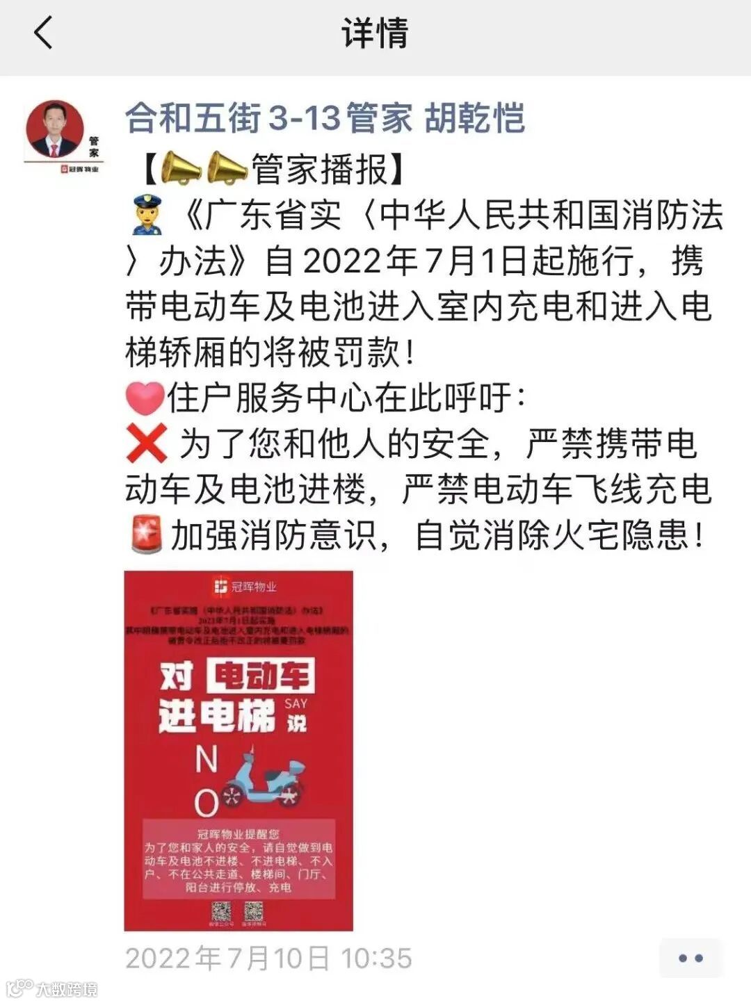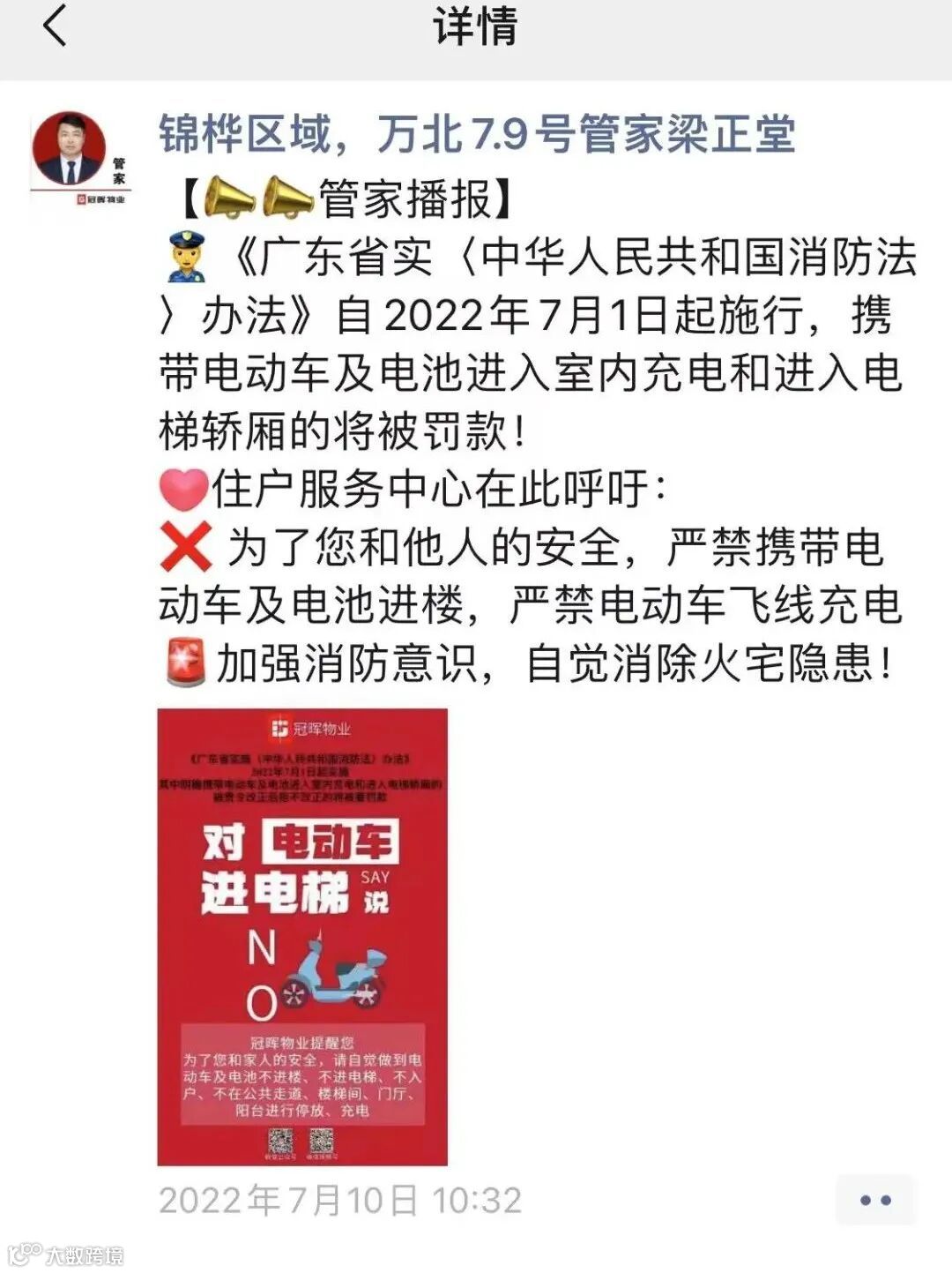 公告栏及停车棚区域张贴电动车防火宣传,通过管家企业微信发送安全宣传,让每位家人都能了解电动车安全管理知识。