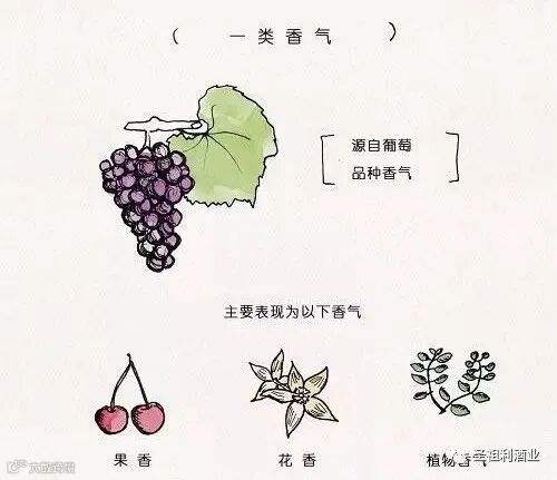 葡萄酒的一类香气为果香或品种香,是指由葡萄自身带来,表现其品种特性的香气。对于葡萄酒来说,果香就是它生命力的象征,我们可以通过酒中的果香来判断葡萄酒是否已经进入衰老阶段。同时,果香也是葡萄酒典型性的具体体现,不同葡萄品种、气候环境和栽培条件都会影响到酒的果香。一类香气一般包括花香、果香、植物香与矿物味。