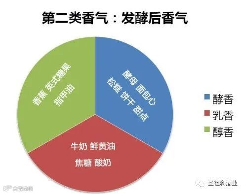 二类香气指在葡萄酒在酿造过程中产生的味道,又称酒香,主要由参与发酵的微生物带来。常见的二类香气包括奶油、黄油、烤面包、啤酒、酵母、干酪、马厩、谷仓等等,它们有些来自酵母的酒脚接触,有些来源于苹果酸-乳酸发酵,而像马厩这类看似奇葩的味道,则是来源于一种特殊的酵母——酒香酵母。通常,二类香气在葡萄酒陈酿过程中会渐渐淡化,它是葡萄酒三类香气中最难感知到的一类香气。