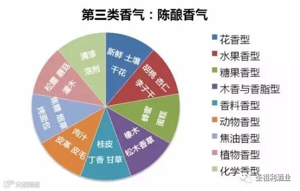 三类香气指陈酿过程给葡萄酒带来的香气,又称醇香,是葡萄酒在成熟过程中逐渐形成的。这些香气有些来源于橡木桶的风味,有些则是由果香、酒香经过一系列化学变化发展而来。经过陈酿的葡萄酒,各种香气趋于协调与融合,香气的复杂性也随之上升。