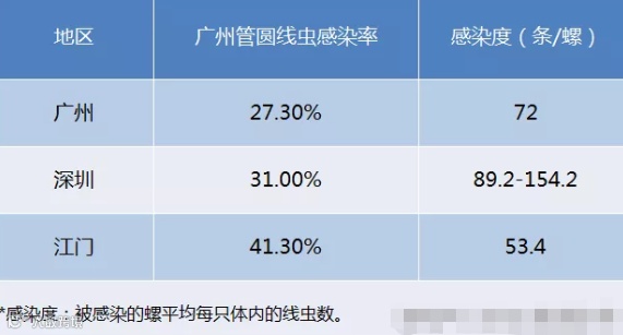 在深圳:褐云玛瑙螺的广州管圆线虫感染率为31.0%,感染度为介于89.2-154.2条/螺。