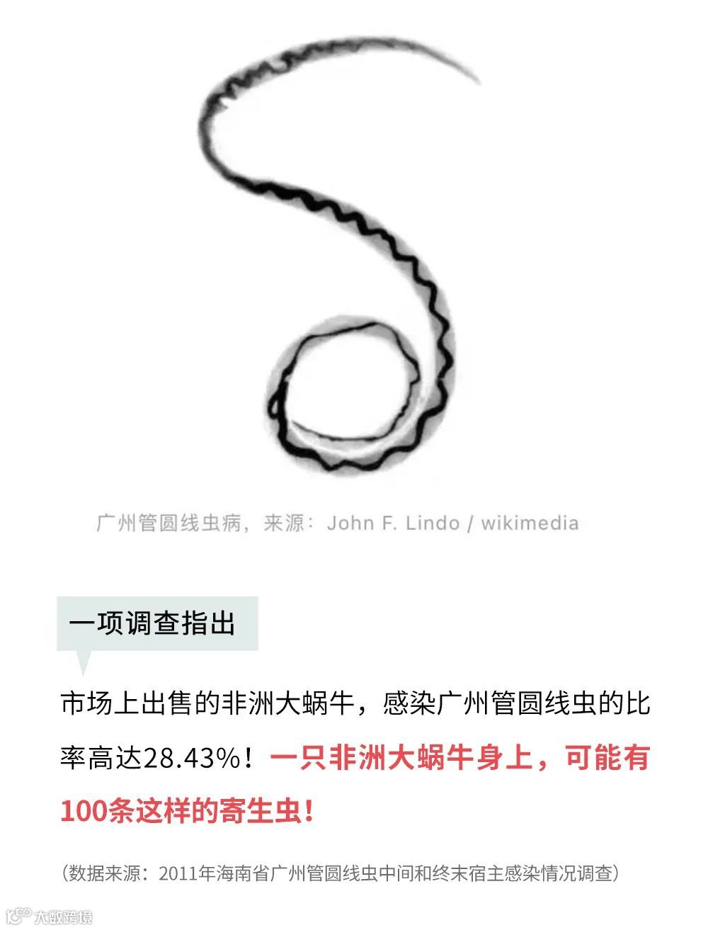 据了解,广州管圆线虫是一种寄生虫,能引起人兽共患寄生虫病。它的终宿主是鼠,中间宿主包括褐云玛瑙螺、福寿螺、蛞蝓(即:鼻涕虫)等。而人是广州管圆线虫的非正常宿主。