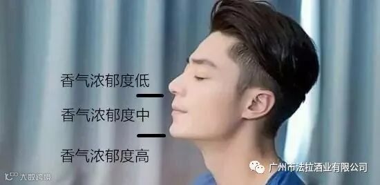 当你闻到酒香的时候,立刻停住酒杯的上移,此时,留意酒杯所在的位置,即可判断香气的浓郁度。判断标注如下: