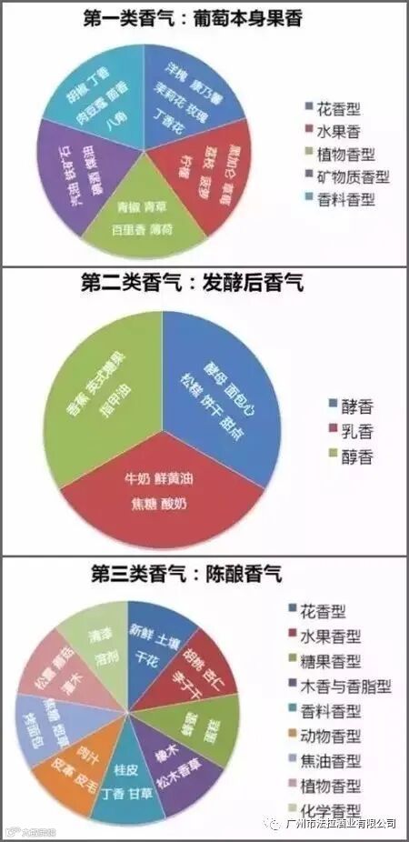 葡萄酒一共有三大类香气,分别是葡萄本身香气、发酵产生香气、陈酿产生香气,下面的三张图就具体描述了这三类香气。