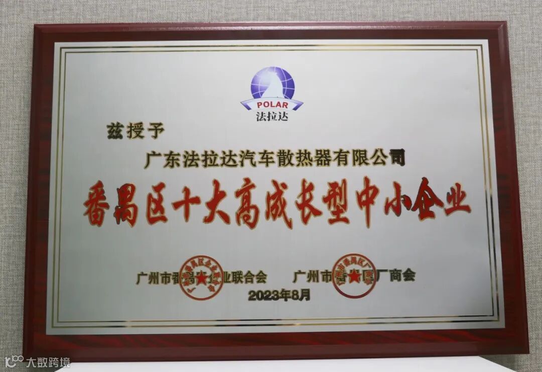● 2023年8月法拉达集团荣获“番禺区十大高成长型中小企业”荣誉称号