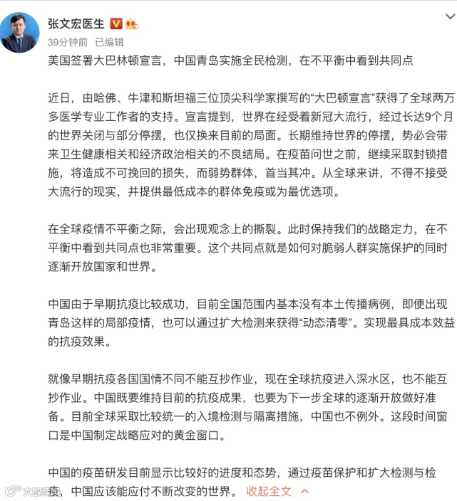 上海复旦大学附属华山医院感染科主任张文宏10月12日在其微博上发表文章称,中国由于早期抗疫比较成功,目前全国范围内基本没有本土传播病例,即便出现青岛这样的局部疫情,也可以通过扩大检测来获得“动态清零”。实现最具成本效益的抗疫效果。中国的疫苗研发目前显示比较好的进度和态势,通过疫苗保护和扩大检测与检疫,中国应该能应付不断改变的世界。