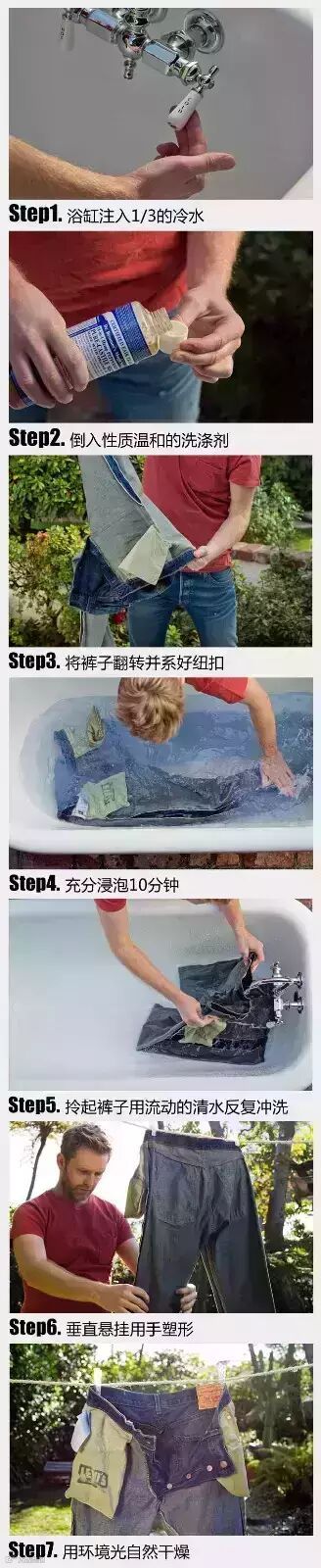 清洗牛仔裤的最佳场所是浴缸!冷水浸泡、清水漂洗、悬挂晾干,如果你愿意,穿着牛仔裤躺在浴缸里是最完美的清洗方法!