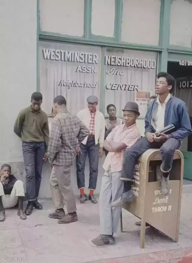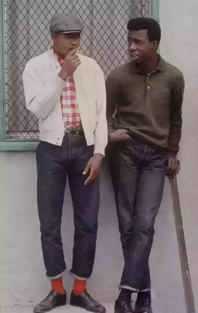 在60年代的洛杉矶黑人社区,卷起裤脚的原色牛仔裤露出鲜艳的袜子并搭配德比鞋、贝雷帽成为那个年代最经典的黑人风尚