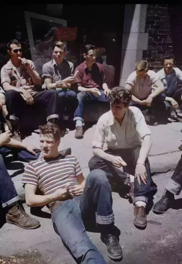 这是50年代的美国男青年最常见的穿着打扮——水洗棉质衬衫与短袖上衣,卷起裤脚的靛蓝牛仔,以及不怎么干净的工装短靴