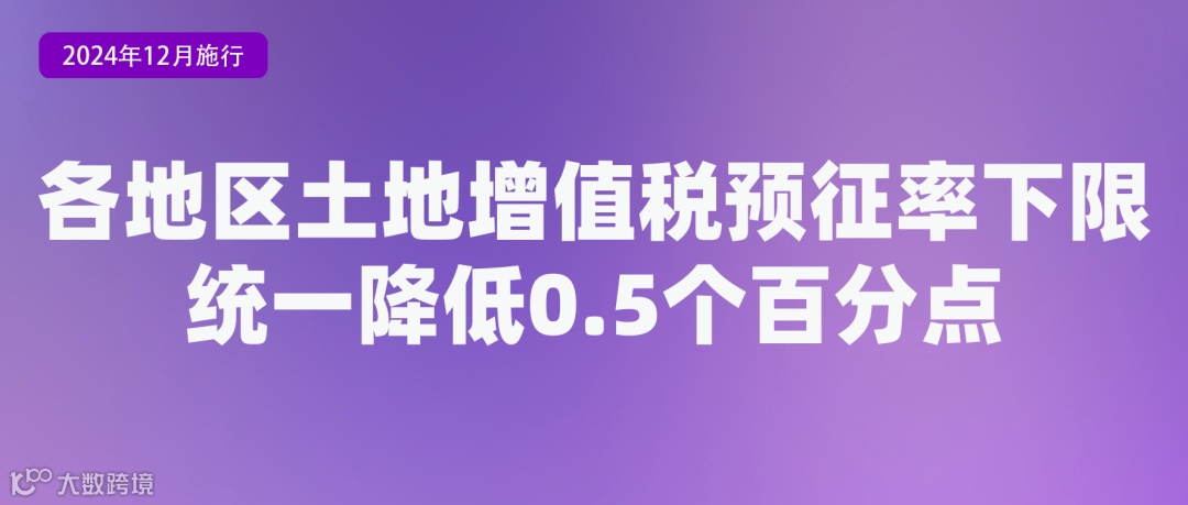 国家税务总局日前发布《关于降低土地增值税预征率下限的公告》,将土地增值税预征率下限降低0.5个百分点。调整后,除保障性住房外,东部地区省份预征率下限为1.5%,中部和东北地区省份预征率下限为1%,西部地区省份预征率下限为0.5%(地区的划分按照国务院有关文件的规定执行)。该公告自2024年12月1日起施行。