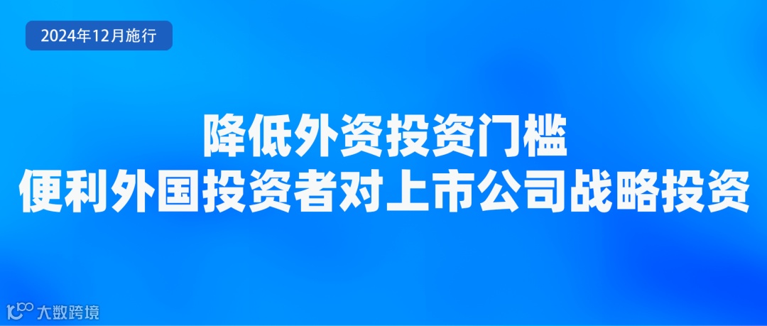 11月1日,商务部、中国证监会、国务院国资委、税务总局、市场监管总局、国家外汇局修订发布《外国投资者对上市公司战略投资管理办法》,自2024年12月2日起施行。修订后的《办法》主要是从五方面降低了投资门槛。一是允许外国自然人实施战略投资。二是放宽外国投资者的资产要求。三是增加要约收购这一战略投资方式。四是以定向发行、要约收购方式实施战略投资的,允许以境外非上市公司股份作为支付对价。五是适当降低持股比例和持股锁定期要求。