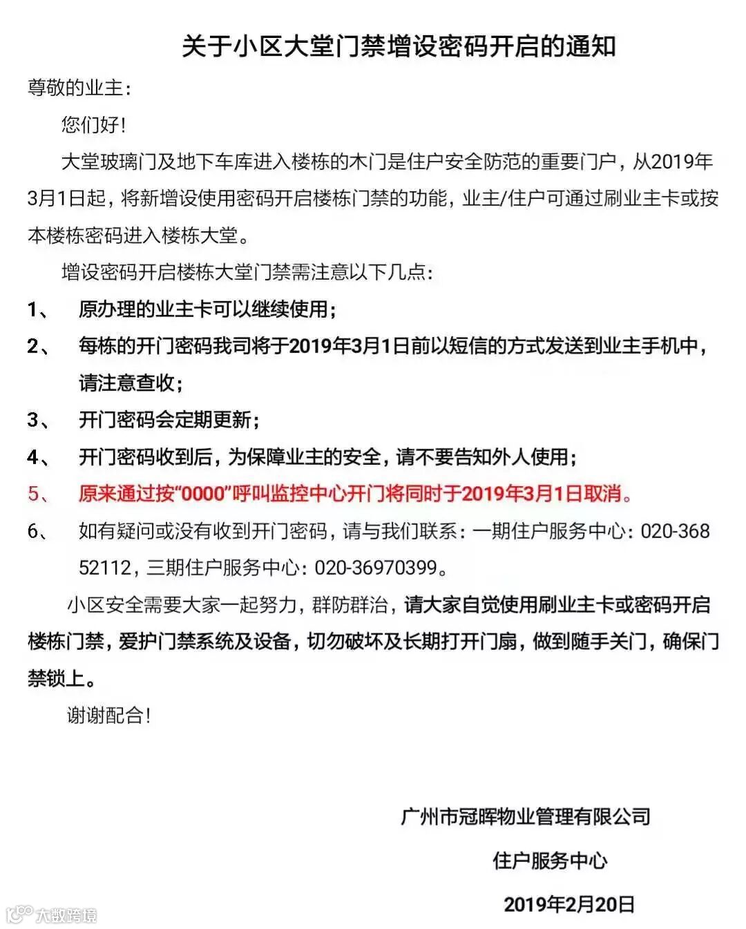 社区通告 | 关于小区大堂门禁增设密码开启的通知