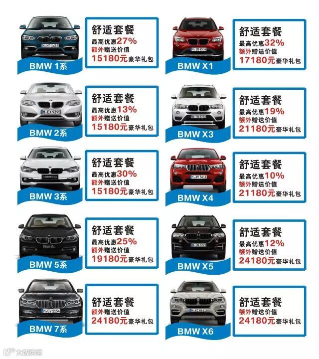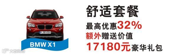 例:原价为41.0万的BMW X1总经理限时优惠价30.3万,优惠总共有三种,分别为:舒适套餐,时尚套餐,科学套餐,尊享套餐。购买舒适套餐更可享受27.9万的优惠价格,购买舒适套餐可享受28.3万的优惠价格,购买科学套餐可享受28.7万的优惠价格,购买尊享套餐可享受29.1万。
