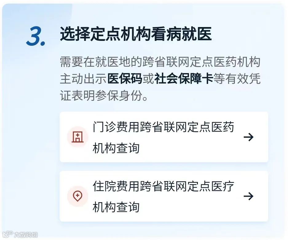 根据自己的需求,选择跨省联网定点医药机构,可线上直接查询就医地是否开通门诊或住院跨省直接结算服务。