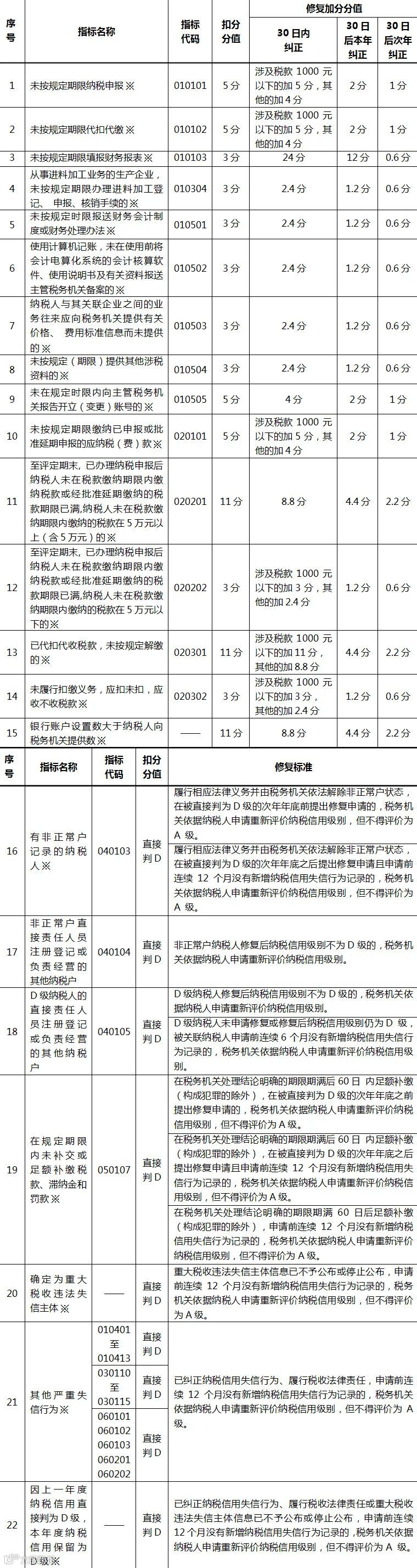那么,具体的纳税信用修复范围都有哪些?修复加分分值和修复标准怎么算?请收好下面这张表↓↓↓