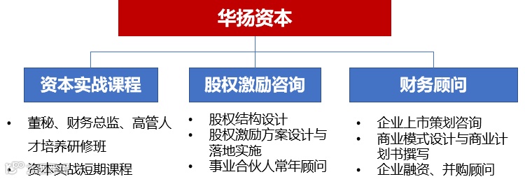 作为专注企业资本价值提升的服务商,华扬资本业务范围主要分为三大板块。其中包含为资本企业董事长、董秘、财务总监等高管人才培养的实战课程;为创业企业、成长型企业及上市企业提供的股权结构设计、股权激励方案设计与实施、专业团队常年顾问服务;为企业上市策划咨询、商业模式设计与计划书撰写及企业融资与并购顾问服务。