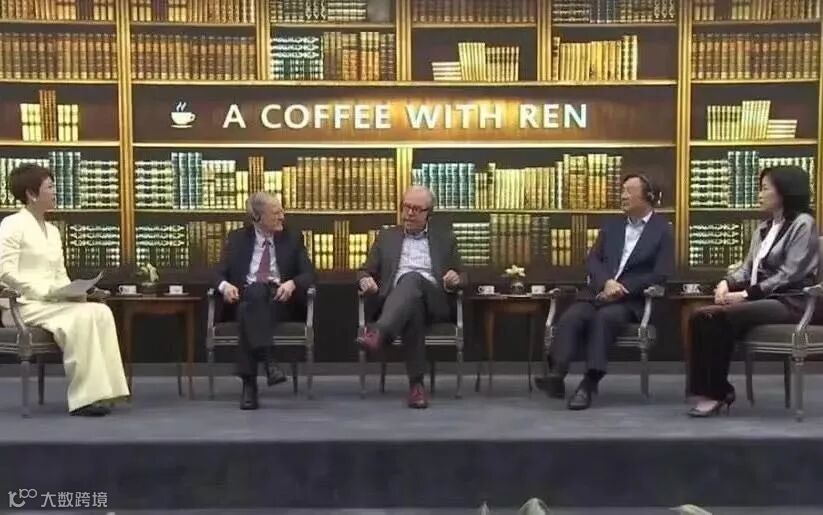 图 | 左起分别为:CGTN主持人田薇、《福布斯》著名撰稿人乔治·吉尔德、美国《连线》杂志专栏作家尼古拉斯·内格罗蓬、华为创始人兼CEO任正非、华为公共及政府事务部总裁陈黎芳