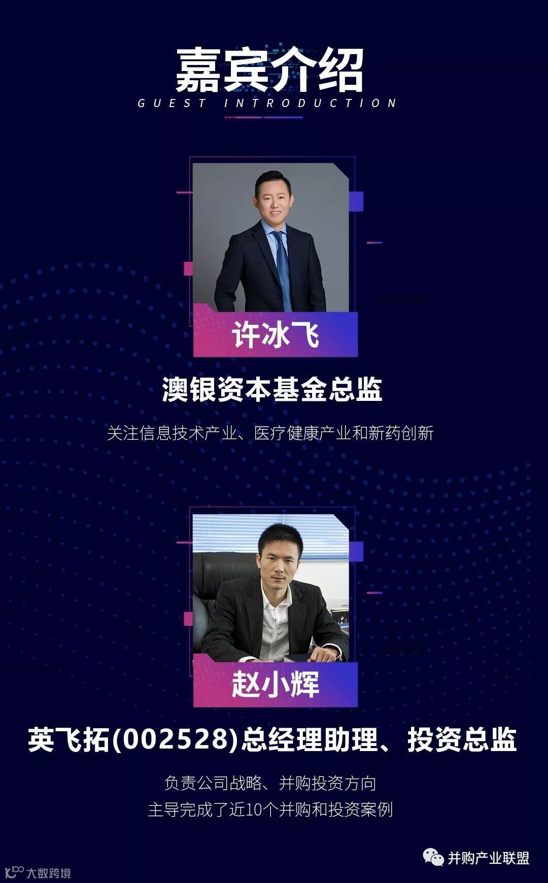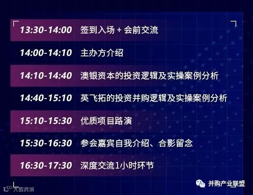 【并购产业联盟】第六期沙龙活动将邀请两位来自国内知名投资机构『澳银资本』和上市公司『英飞拓-002528』的嘉宾,为大家分享澳银资本和英飞拓的投资并购逻辑,深入浅出的讲解机构和上市公司所青睐的企业特质,让你知晓他们关注的领域,以及对项目的投资并购逻辑。