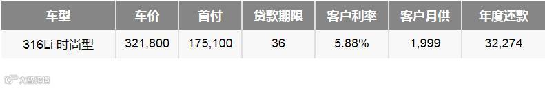 新一年,BMW 3系为您精打细算,以BMW 3系2015超悦版316Li 时尚型贷款36个月举例,首付适当提高,每月1999元轻松月供,不仅减轻日常还款压力,还可享有年度灵活还款。
