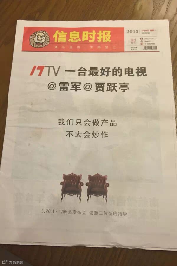 “17TV,一台最好的电视,@雷军@贾跃亭:我们只会做产品不太会炒作!520产品发布会诚邀二位莅临指导。”5月18日,进军智能电视的新品牌17TV登出整版广告,隔空邀请互联网电视行业的两位大佬参加其新品发布会。