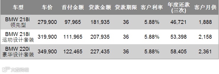 创新BMW 2系运动旅行车精心为您打算,以创新BMW 2系运动旅行车218i领先型为例,贷款36个月,首付35%,每月1,888元超低月供轻松还贷,不仅减轻日常还款压力,还可享有年度灵活还款。