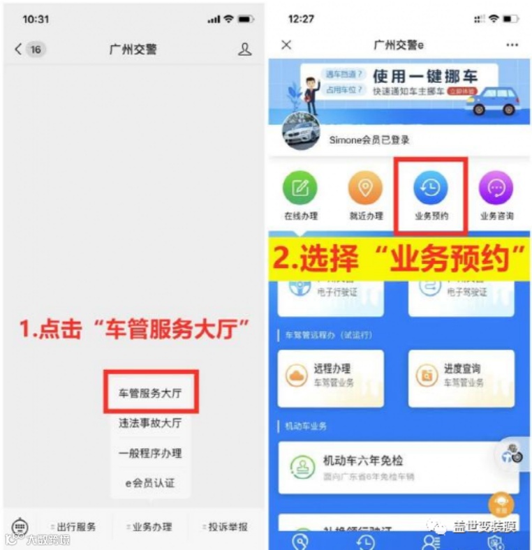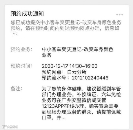 车辆改完颜色之后,车主本人要在10日内,预约到当地车管所(可异地办理)办理车身改色后的备案手续。不同城市的车管所,都有公众号或办事小程序,可以进行直接预约。以广州市为例,“广州交警”微信公众号有直接的预约通道,具体步骤如下图: