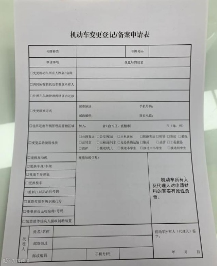 1、填写机动车变更登记/备案申请表