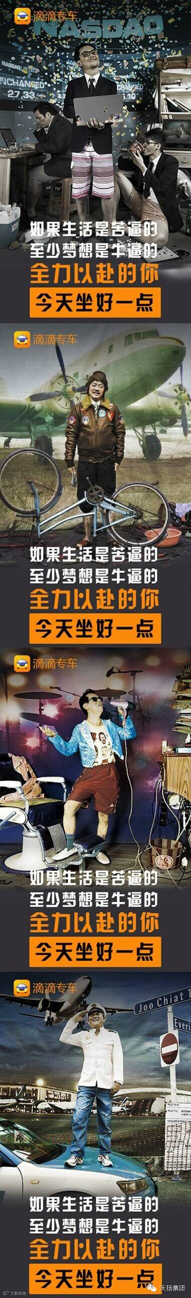 每个人年轻的时候都可能有一个美丽的梦想,有的虽看似遥不可及,他们依然全力以赴的为之奋斗;有的甚至仅因为年轻时曾吹过的牛逼而“苦逼”的坚持着。因此滴滴专车针对这些苦逼又牛逼,咬着牙流着血依然全力以赴的人做了一系列现实与梦想的传播,提倡人们在追梦的过程中,也不要忘了停下脚步,活在当下,今天坐好一点。于是下面这组滴滴专车与国内摄影师范顺赞合作的海报应运而生。日的苦逼只为实现曾经吹过的牛逼!
