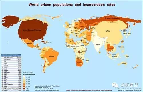 这幅地图揭示了世界各国囚犯人数所占的比例,而美国在这方面遥遥领先。