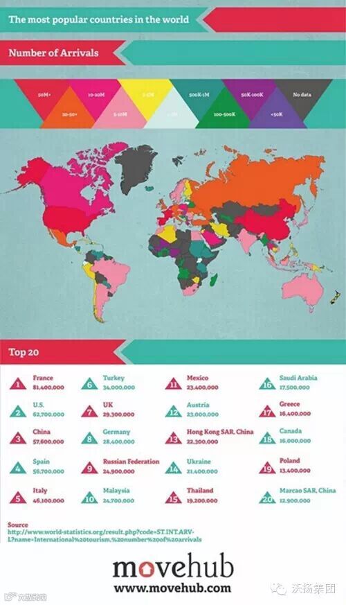 最后的黑色图例代表暂无相关数据。地图下面列出了前20名最受欢迎的旅游国家和地区,其中中国排在第3位。