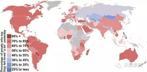 这幅地图揭示了各国民众感觉自己“被别人深爱”所占的比例。