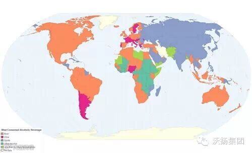 该地图显示了世界各国消耗最多的酒水种类。