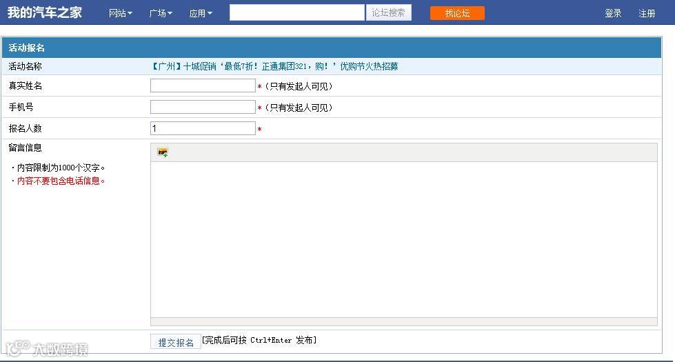 3、参加此次活动的朋友请准确填写真实有效的联系方式,汽车之家工作人员将对所有报名网友进行电话确认,请大家务必保持通讯畅通。联系方式仅您本人及汽车之家工作人员可见。有任何疑问可咨询汽车之家网站电话020-81166390。