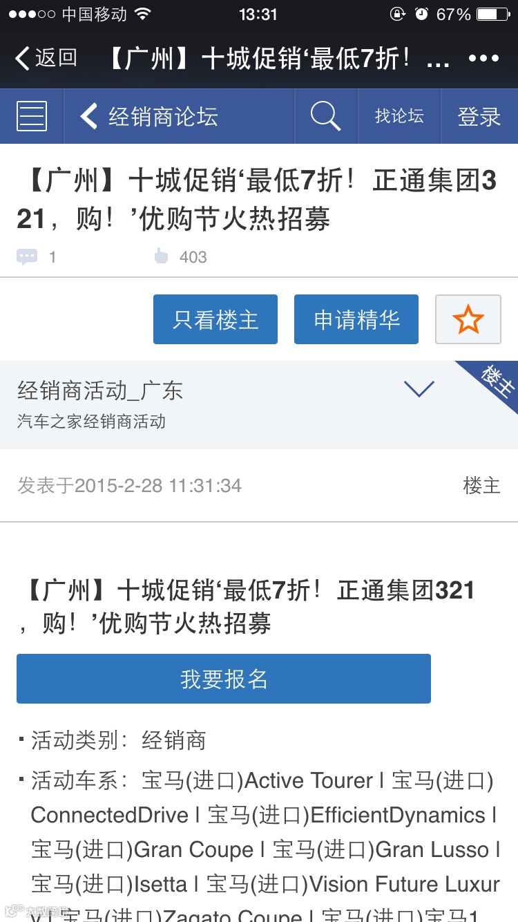 正通汽车集团旗下广州宝泽BMW 5S店,携手汽车之家,于2015年3月21日在广州举办“最低7折!正通集团321,购!”优购节活动,引爆2015年开春!