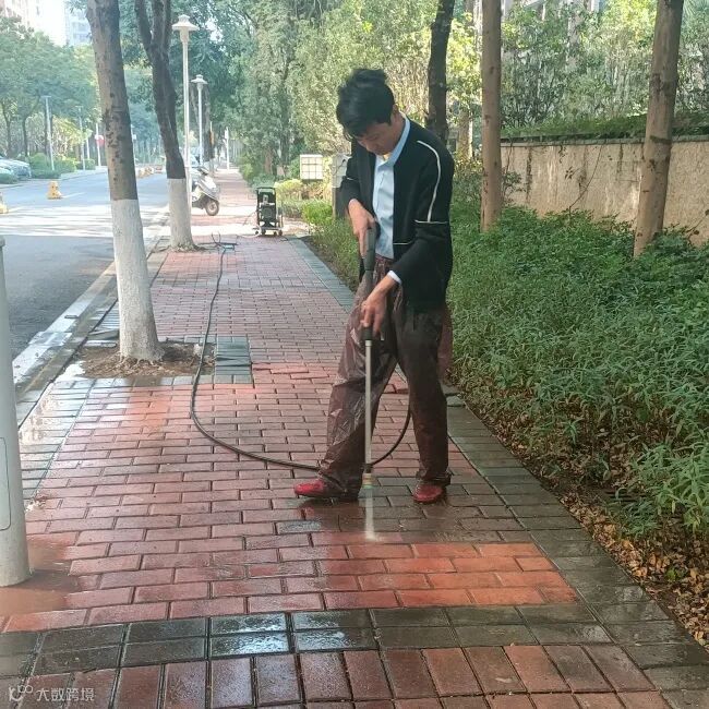 高压水枪冲洗园区人行道路