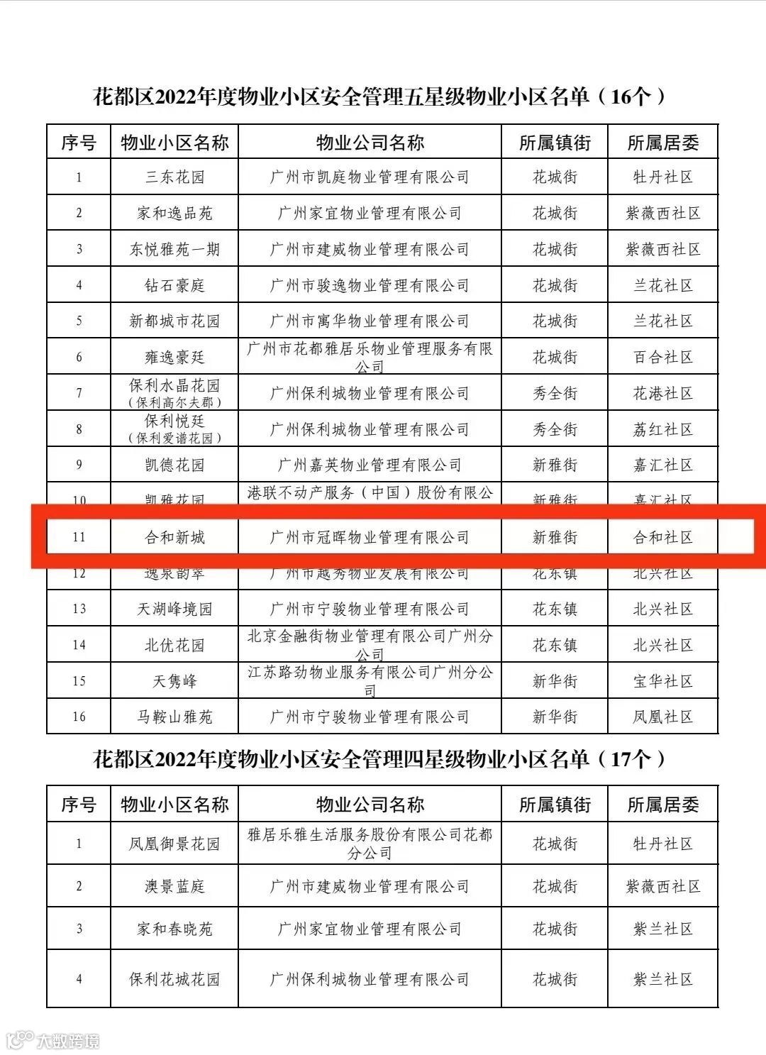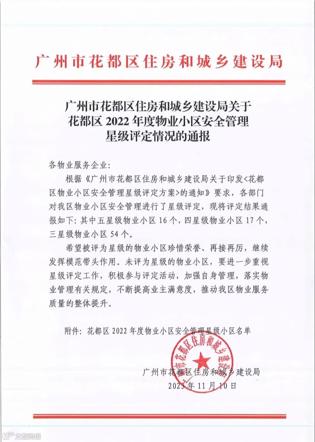 近日广州市花都区住房和城乡建设局公布了2022年度物业小区安全管理星级评定结果的通报,冠晖物业公司以优质、安全、细心、体贴的物业服务荣获“花都区物业小区安全管理五星级物业小区”荣誉称号。