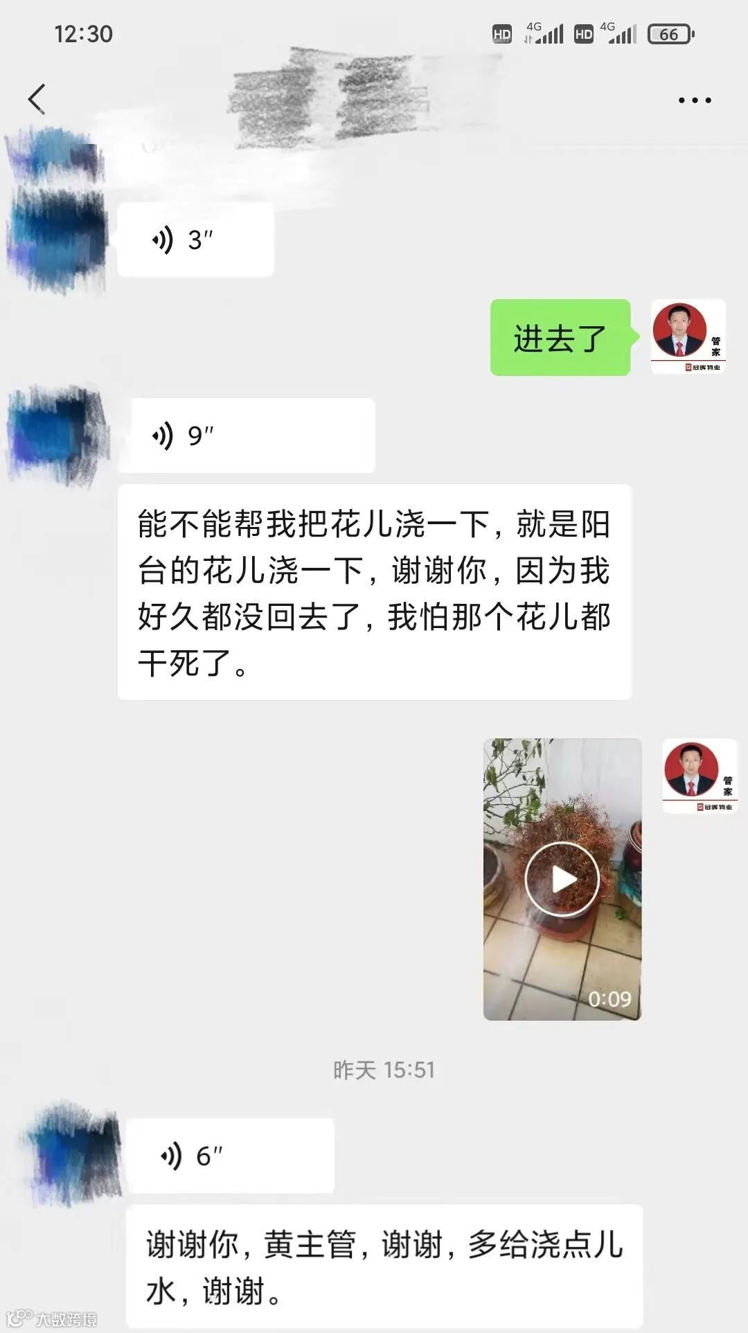 某业主给黄管家发来求助信息,他接到求助信息后马上就答应下来。在取得业主同意的入门码并向公司进行报备后,黄管家就开始上门浇花服务,从穿鞋套、进门、取水再到浇花和离开整个过程全都拍下视频反馈给业主,业主看到后对黄管家表示非常感谢。