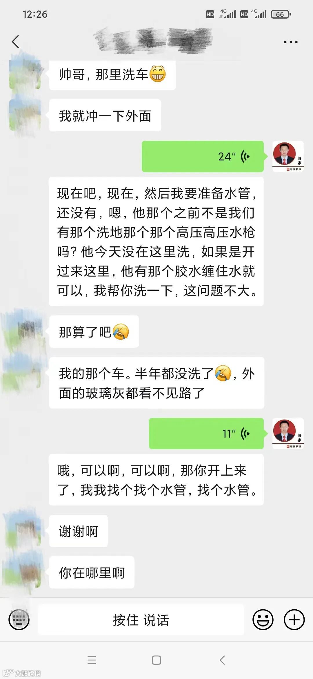 “黄管家,请问哪里可以洗车的呀?我的车半年没有开了,挡风玻璃上积了很多灰尘,看不见路了。”