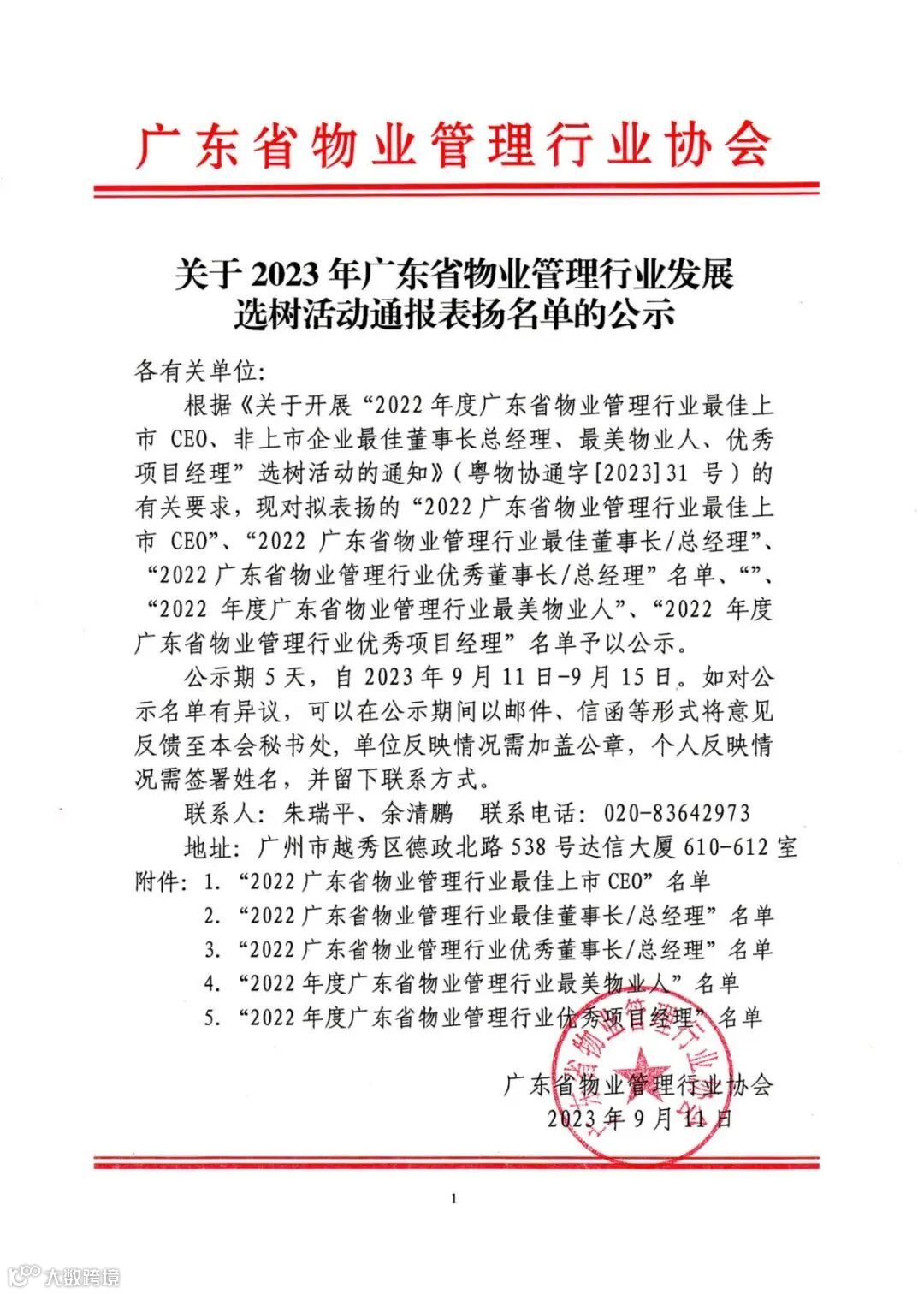 关于2023年广东省物业管理行业发展选树活动通报表扬名单的公示