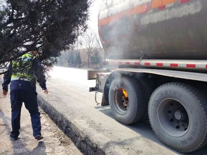 事件:3月27日11时许,长治交通八大队店上中队民警巡逻至辖区519国道东白兔村附近路段时,发现一辆行驶中的危化品半挂牵引货车右后轮处突然冒起黑烟,继而有火苗蹿出。