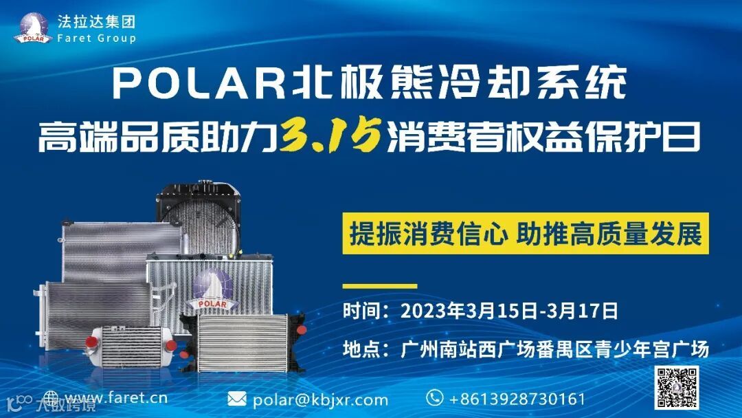 法拉达高端品质助力315消费者权益保护日,提振消费信心,助推高质量发展。2023年3月15日为努力营造放心消费环境,进一步扩大“ 3•15” 活动影响力,广州市番禺区政府在广州南站西广场举办“提振消费信心,助推高质量发展 ”为主题的番禺区2023年“3·15”国际消费者权益保护日暨高质量番禺智造宣传展示活动。法拉达北极熊冷却系统产品,坚持高端品质并入选此次展示宣传活动。