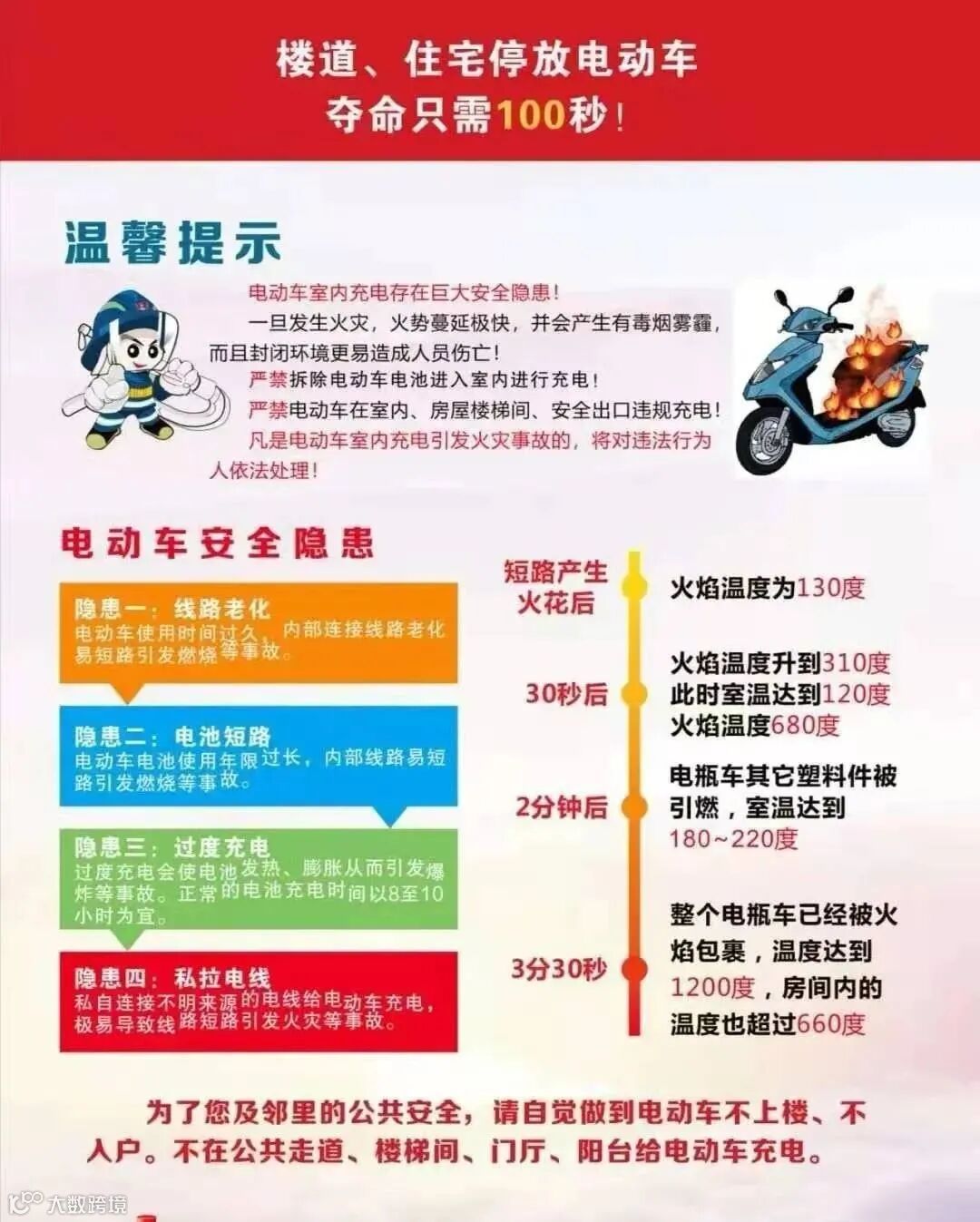 2、根据统计表明:60%的电动车火灾发生在20时至次日5时之间;电动车火灾致人员伤亡的,90%是因为电动车停放在门厅、过道等部位。