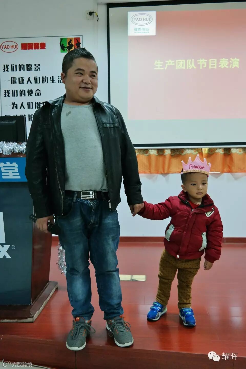 风镜事业部生产曹经理带着他儿子作为员工代表上台发表圣诞心声,他说这是他第一次和家人在一起过圣诞,感谢公司,感谢他老婆给他一个幸福的家庭,未来还有很多个圣诞他希望和家人一起过。