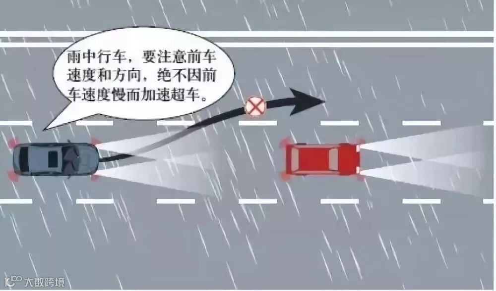 雨天行车要注意加大车距,雨天路面湿滑,路面附着力下降,制动距离增大,容易发生事故。应与前方车辆保持平时两倍以上车距行驶,降低车速,随时注意观察前车驾驶情况,提前做好应急措施准备。