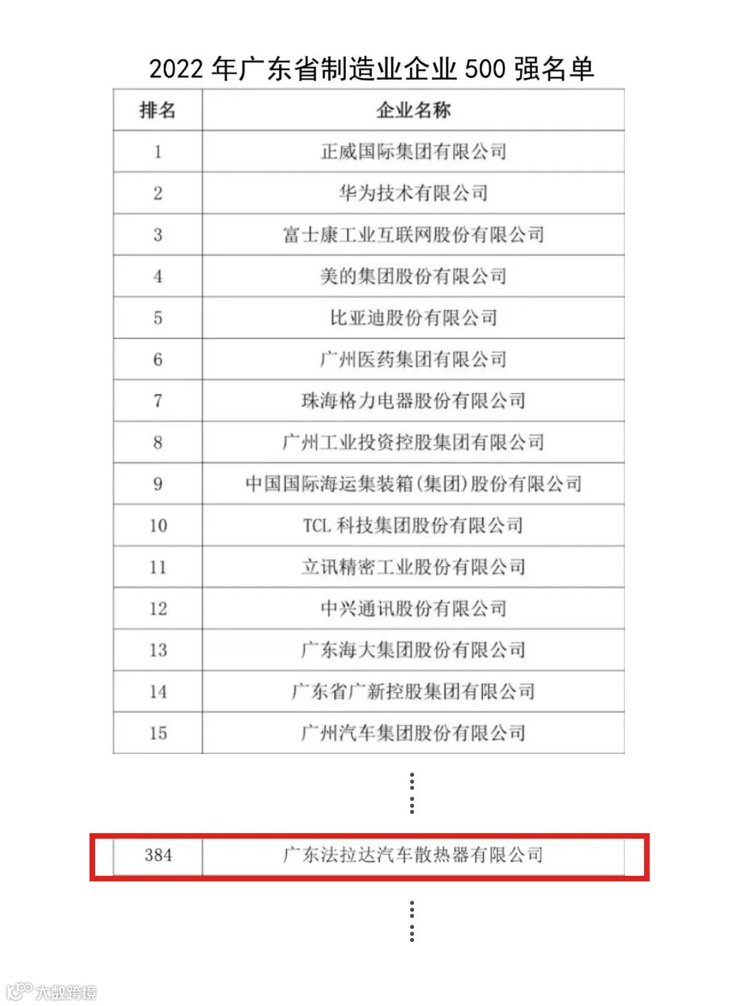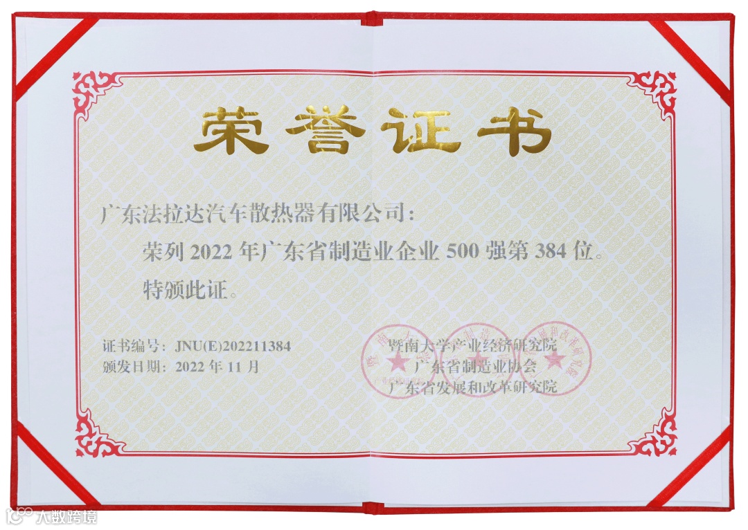 12月28日,广东省制造业发展年会暨广东省制造业500强企业峰会在广州举行。会上发布了2022年广东省制造业500强企业名单。法拉达集团通过推荐申报,公开数据采集调查及核实,并经评审专家委员会审定,法拉达凭借在汽车热管理领域的积极探索以及工艺技术不断创新以及在产业、市场、技术、管理等综合实力,上榜广东省制造业500强,名列第384位。