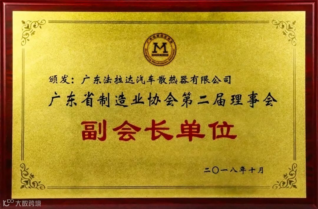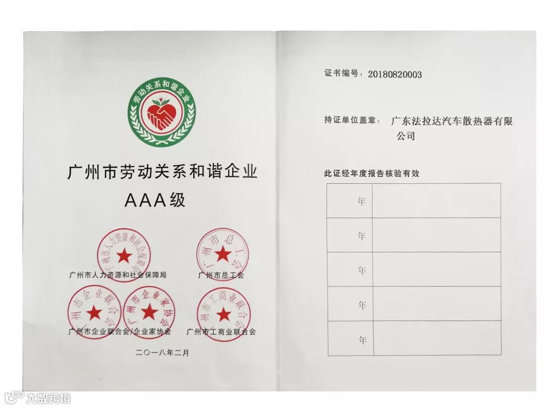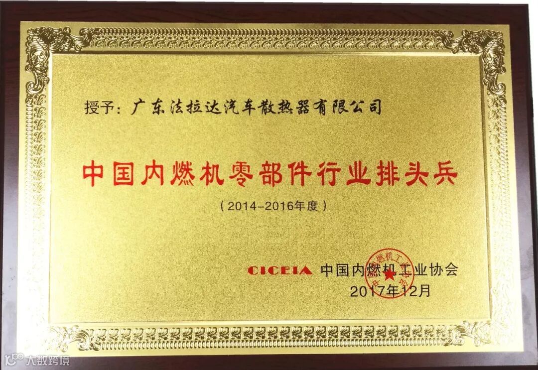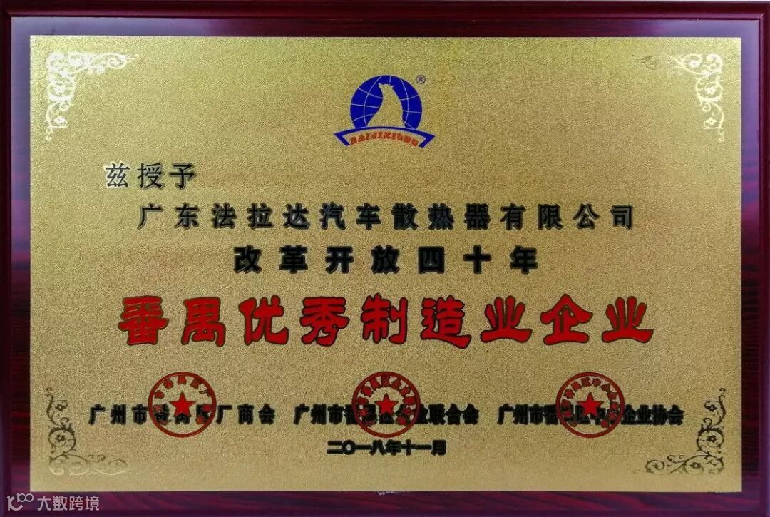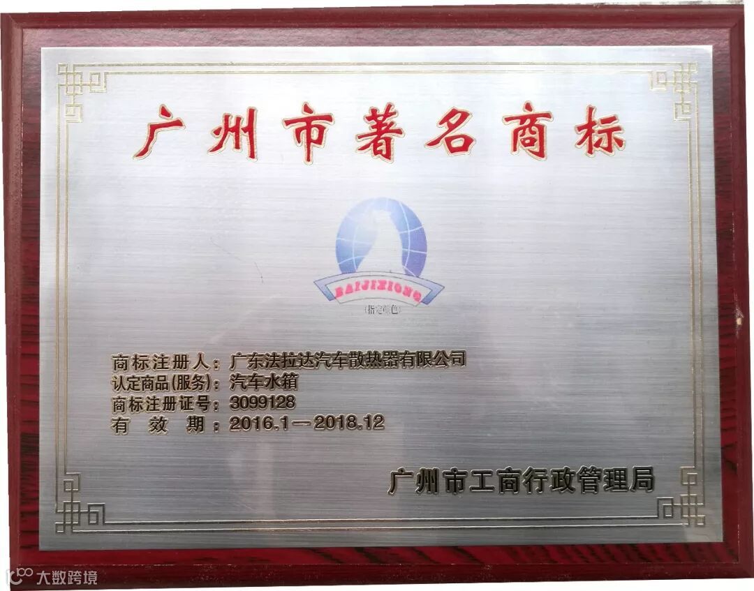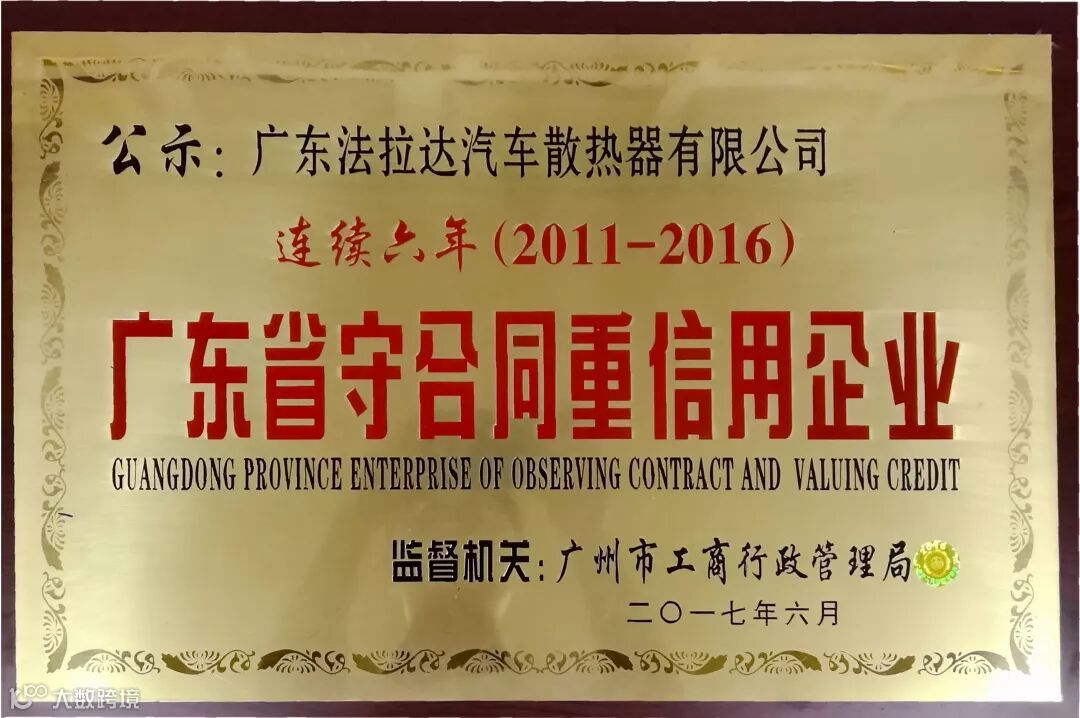 在2018年度法拉达集团荣获<改革开放四十年 番禺优秀制造业企业及优秀企业家>和<产业高端人才>荣誉称号以及荣获番禺厂商会<科技奖>和<纳税奖><广东省制造业协会第二届理事会副会长单位><广东省产业发展促进会第一届理事会副会长单位>,<荣获广州市劳动关系和谐企业AAA级>连续六年荣获<中国银行十佳结算客户荣誉>,连续六年被评为<广东省守合同重信用企业>,连续六年被评为<中国内燃机零部件排头兵企业>,旗下北极熊商标连续六年被评为<广州市著名商标>,旗下北极熊商标连续六年被评为<广东省著名商标>,法拉达获得如此众多荣誉称号是政府对我们的认可,肯定了法拉达处于行业的前列,以及对法拉达的诚信经营的支持!并通过专家严格的审核、综合评价和广东质量品牌评审专家委员会审议确认,法拉达北极熊品牌汽车散热器荣获“广东省名牌产品”称号!